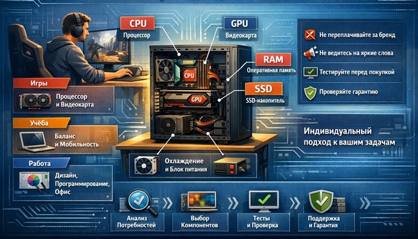 Выбор компьютера сегодня — это не просто покупка «железа», а осознанное решение, от которого зависит комфорт в работе, учебе или играх. Рынок переполнен предложениями, характеристики становятся всё сложнее, а маркетинг часто запутывает сильнее, чем помогает. Разберёмся, как подойти к подбору конфигурации грамотно и без лишних переплат.
