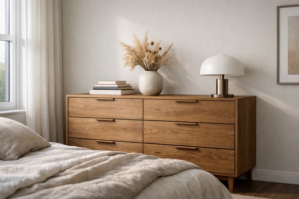 - Для спальни чаще всего выбирают классические модели с тремя–шестью выдвижными ящиками. Они подходят для хранения белья, домашней одежды и различных аксессуаров, помогая поддерживать порядок без необходимости устанавливать громоздкий шкаф.